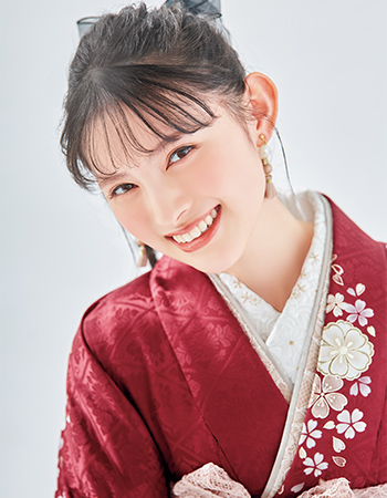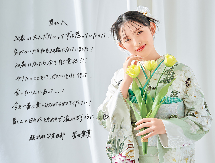 芸能界には小学校5年生のときにラーメンを食べているときにスカウトされて入りました。そこから、がむしゃらにレッスンを受けて今があります。もうすぐ10年目に突入しますね。二十歳を迎えて、挑戦したいこと、叶えたい夢がいっぱいあります。そのうちの一つに、お菓子が大好きなので、お菓子関係の仕事ができたらいいなあって願っています。